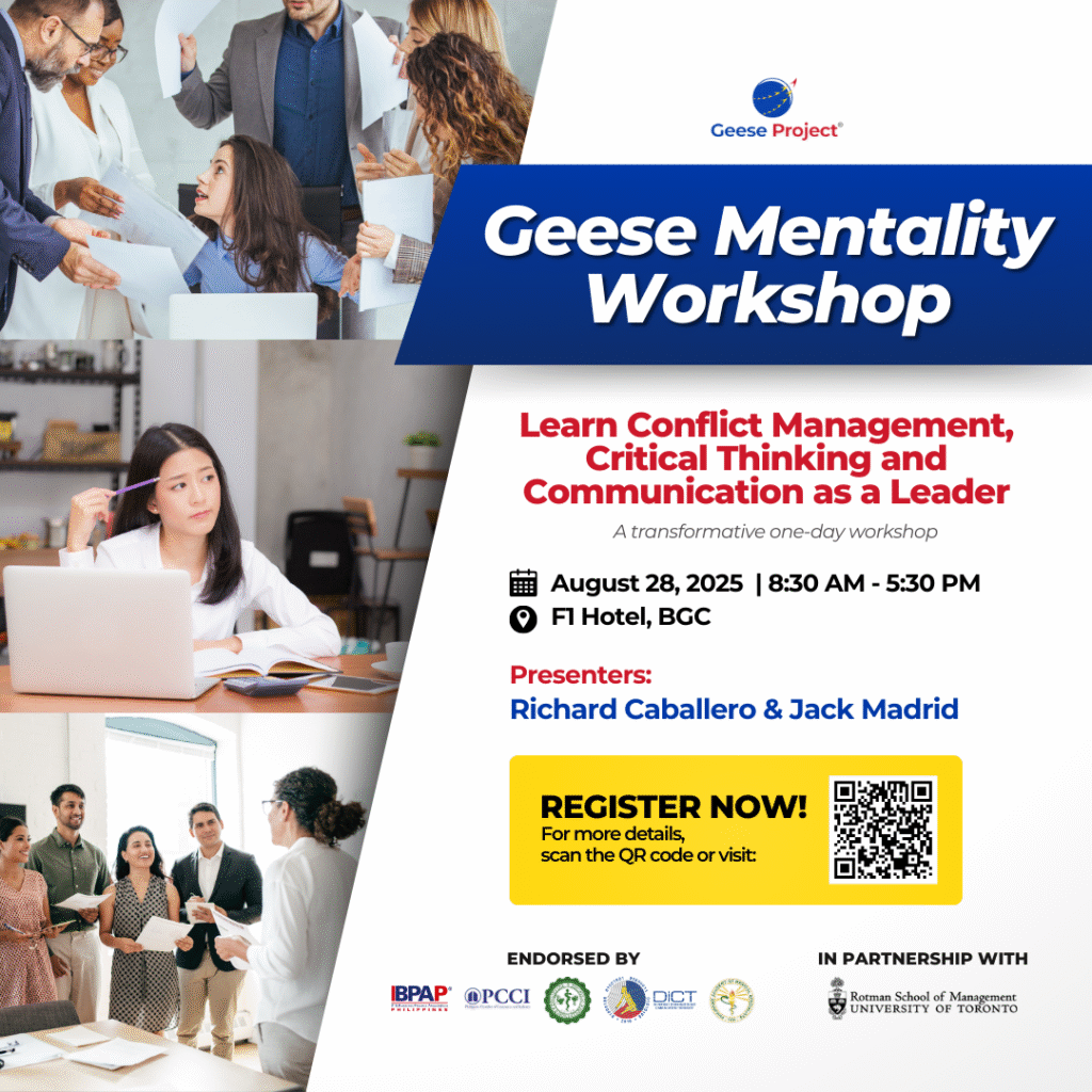 Whether you are looking to advance in your current role or to acquire new leadership skills to lead your teams, the Geese Mentality Leadership Workshop will provide you with the necessary skills and more importantly, the “right mindset” to become a world-class Filipino leader.